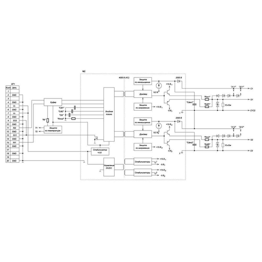 The DR2150P-B2 driver is a two–channel driver for high-power SiC-MOSFET transistors, designed for galvanically isolated control of two transistors with a maximum permissible voltage of up to 1700 V in the "Economical" design. The driver is an amplifier that generates transistor gate control signals with a frequency of up to 100 kHz. The driver contains a built-in galvanically isolated DC/DC converter that provides the necessary levels of unlocking and locking voltages at the transistor gates.